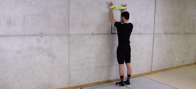 Der Patient steht aufrecht mit einer Armlänge Abstand und schaut Richtung Wand. Um die Handgelenke wird ein Band gespannt, sodass die Unterarme schulterbreit zueinanderstehen. Die Unterarme werden nun so an die Wand gestützt, dass die Daumen zum Körper zeigen und der aufrechte Oberkörper leicht nach vorne geneigt ist.