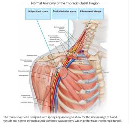 Der Plexus brachialis sowie die Arteria subclavia passieren das interscalene Dreieck, eine dreieckige Lücke, deren Ränder der Musculus scalenus anterior, der Musculus scalenus medius sowie die erste Rippe bilden. Dieses Dreieck ist klein: Kadaver-Studien berichten über eine durchschnittliche Weite von 0,9 Zentimetern. Studien in vivo, also an lebenden Personen im Operationssaal, zeigen eine Weite von 0,67 Zentimetern bei Frauen und 0,77 Zentimetern bei Männern. Die Vena subclavia verläuft ventral des Scalenus anterior und muss das Dreieck nicht passieren.Neben der Enge im interscalenen Dreieck kann eine costoclavikuläre Enge, sowie eine Enge unter dem Pectoralis minor für ein Engpass-Syndrom verantwortlich sein, denn auch hierher verlaufen sowohl Vena als auch Arteria subclavia, sowie der Plexus brachialis.